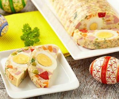 - Doprostřed vyskládejte celá vejce, přidejte zbytek ostatních surovin a zalijte zbylou směsí. Formu nechte v ledničce chladit asi 3 hodiny, pak tlačenku opatrně vyklopte a podávejte ji nakrájenou na plátky.